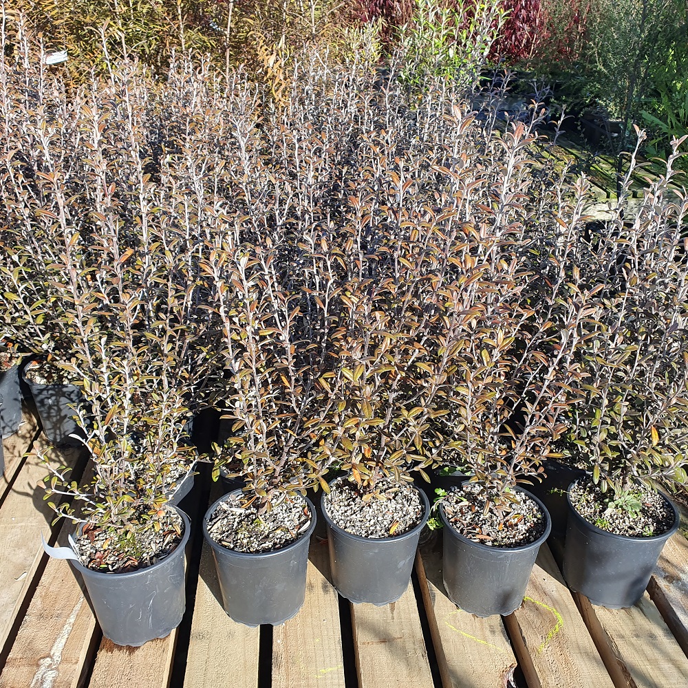 Corokia x virgata ‘Frosted Chocolate’, also known as Korokio, is a New Zealand native evergreen shrub with distinctive bronze-green foliage that intensifies to a chocolate color in cooler months. It is known for its hardiness, tolerating coastal conditions, strong winds, and dry soils. This versatile plant is suitable for hedging, borders, and screens, and produces fragrant yellow flowers in spring followed by red berries.