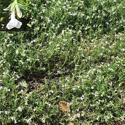 Lithodora ‘Snow Carpet’ is a low-growing, evergreen perennial that forms a mat of dark green foliage and is covered in small, white, star-shaped flowers during spring and summer. It thrives in sunny to partially shaded locations with well-drained soil, particularly sandy or loamy soil. Lithodora ‘Snow Carpet’ is relatively low-maintenance, requiring regular watering, especially when first planted, and occasional pruning to maintain shape after flowering.